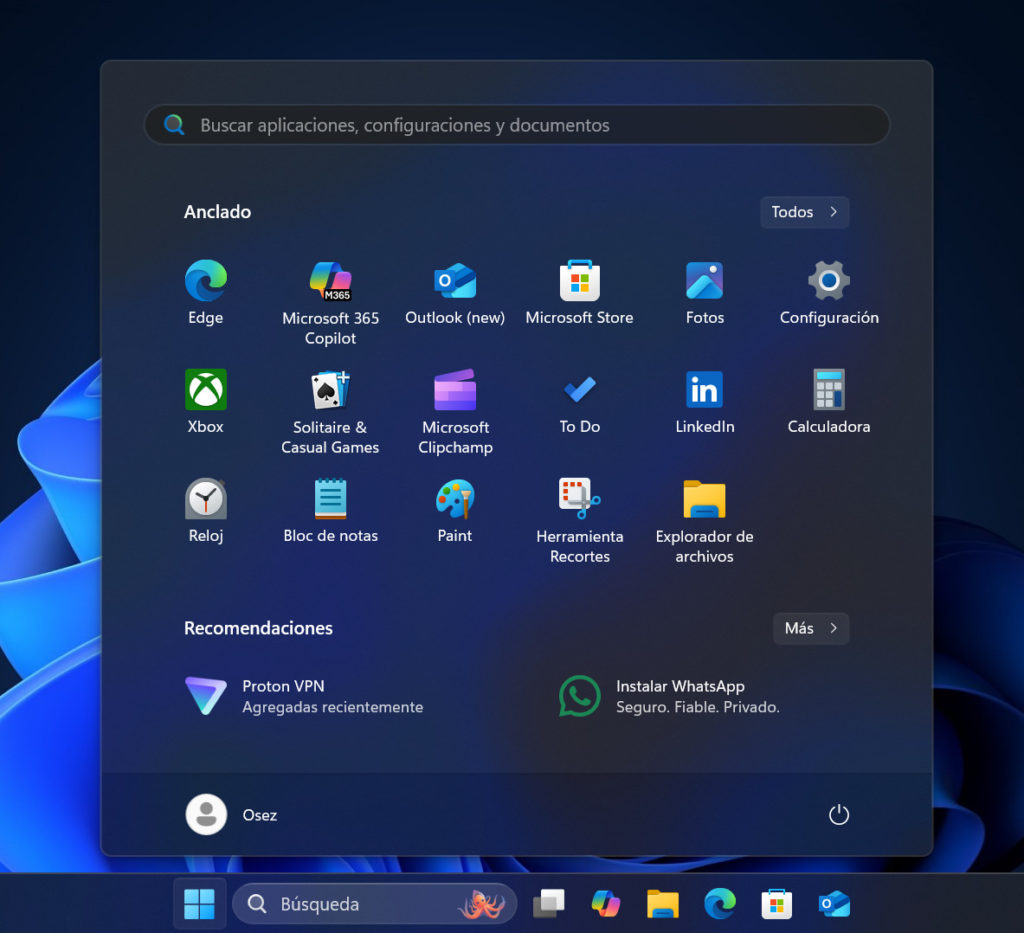 Para acceder, haz clic en el Menú Inicio y selecciona el icono de la rueda dentada, o simplemente busca “Configuración” en la barra de búsqueda.